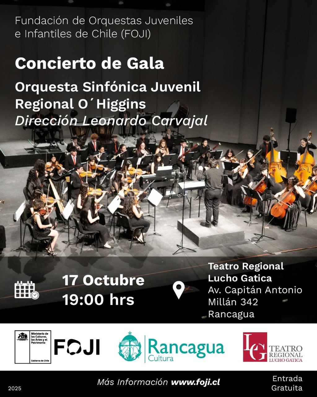 La OSJR O’Higgins realizará su tradicional Concierto de Gala, programado para este viernes 17 de octubre a las 19:00 horas en el Teatro Regional Lucho Gatica de Rancagua. El ingreso será con entrada liberada, previo retiro de tickets en las boleterías del teatro.