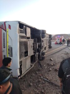 El bus transportaba 46 trabajadores salientes de turno , más el conductor, quien habría perdido el control del móvil en una curva de dicha ruta, volcándose sobre la pista de circulación.